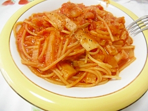 フライパン一つで簡単 新玉ねぎと竹輪のトマトパスタ レシピ 作り方 By へんてこぽこりんママ 楽天レシピ